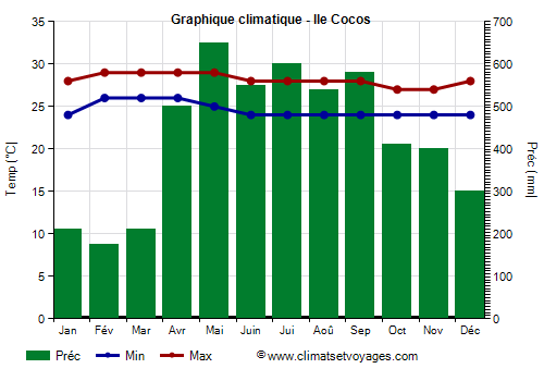 Ile Cocos - Températures moyennes| Mois | Min (°C) | Max (°C) | Moyenne (°C) |