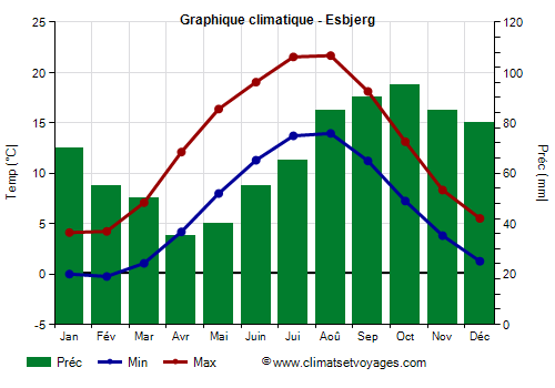 Esbjerg - Précipitations moyennes| Mois | Quantité (mm) | Jours |