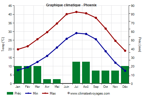 Phoenix - Températures moyennes (1991-2020) | Mois | Min (°C) | Max (°C) | Moyenne (°C) |