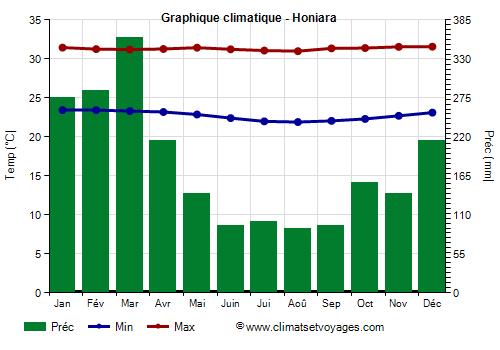 ensoleillement, n'est ni exceptionnel, ni faible ; il est assez uniforme dans l'ensemble de l'année : le soleil brille assez souvent, mais la condensation fréquente produit des bancs de nuages, qui peuvent conduire à des averses et d'orages. Honiara reçoit 2 300 heures de soleil par an.