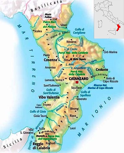 La Calabre, la pointe de la botte, est une région du sud de l'Italie, face à la mer Tyrrhénienne à l'ouest et à la mer Ionienne à l'est. Au sud, le détroit de Messine la sépare de la Sicile. À l'intérieur des terres, la Calabre est traversée par des chaînes de montagnes appartenant aux Apennins méridionaux, qui tombent souvent directement dans la mer, alors qu'il y a peu de plaines.